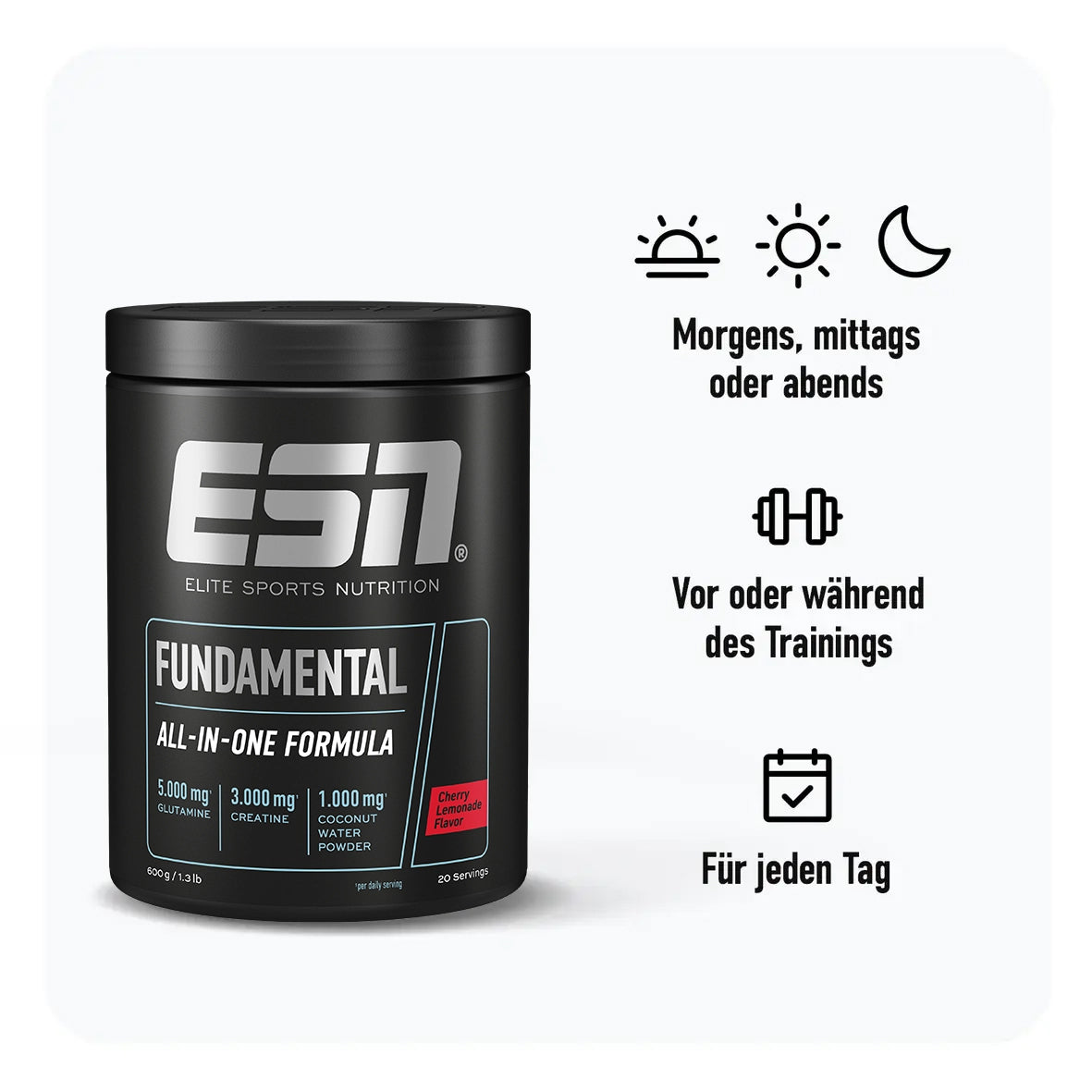 L-Glutamin, L-Citrullin-Malat (2:1), Kreatinmonohydrat, Elektrolytmischung 11 % (Tri-Natriumcitrat-Dihydrat, Kaliumcitrat, Calciumcitrat, Magnesiumcitrat), L-Glycin, L-Carnitin-Tartrat, Beta-Alanin, Taurin, L-Prolin, Dextrose, Kokoswasserpulver, Aroma, färbendes Lebensmittel (Rote-Bete-Pulver), Trennmittel (Siliciumdioxid), Vitamin C (Ascorbinsäure), Säuerungsmittel (Citronensäure), Süßungsmittel (Sucralose, Acesulfam K), Farbstoff (Carotin), Extrakt aus Panax notoginseng und Astragalus membranaceus (Astragin®).Key Facts - Fundamental