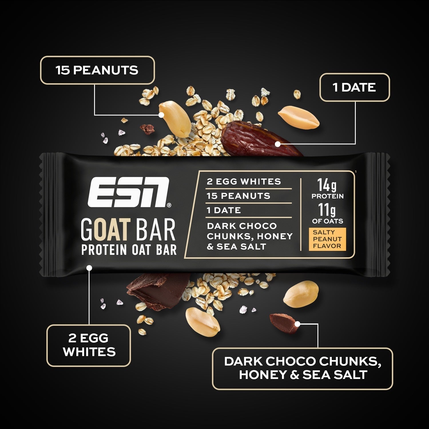 Haferflocken (glutenfrei) 20 %, geröstete Erdnüsse 19 %,Eiklarpulver 17 %, Dattelpaste 11 %, Dunkle Schokoladen Stückchen 7 % (Kakaocreme, Zucker, Kakaobutter, Emulgatoren (Lecithin (Soja), Polyglycerin-Polyricinoleat), Aroma), Oligofruktose, Invertzuckersirup, Honig 6 %, Sojakrispies (isoliertes Sojaprotein, Tapiokastärke, Salz), Kokusnussfett, Meersalz, Meersalzflocken, AromaKey Facts - GOAT Bar