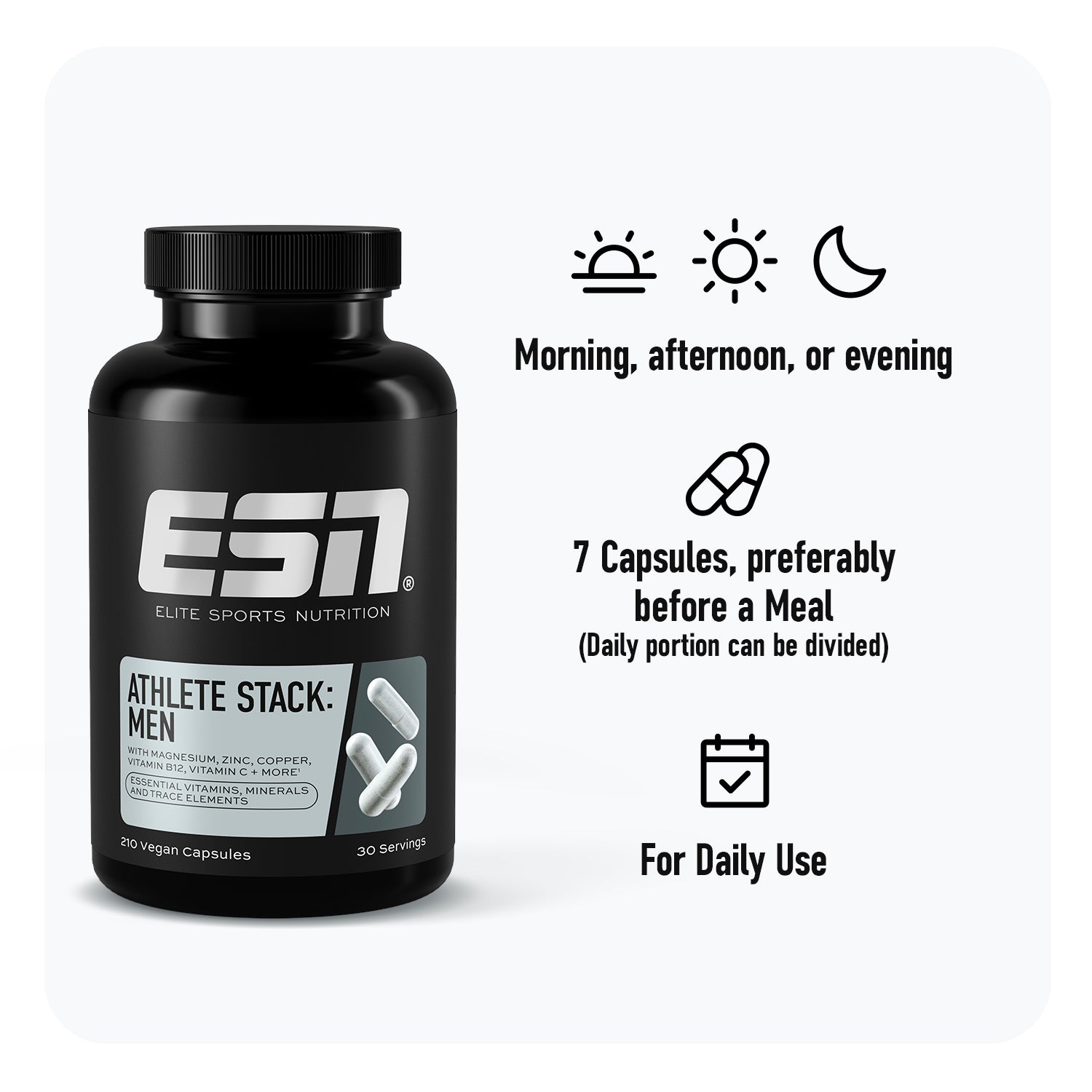 Vitamin and Mineral Blend 84% (CalciumCitrate, Magnesium Citrate, Potassium Citrate, Vitamin E (Mixed Tocopherols), Vitamin C (Ascorbic Acid), Iron Bisglycinate, Zinc Bisglycinate, Anti-Caking Agents (Magnesium Salts of Fatty Acids, Silicon Dioxide), Niacin (Nicotinamide), Folic Acid (Pteroyl Monoglutamic Acid), Pantothenic Acid (Calcium D-Pantothenate), L-Selenomethionine, Vitamin D (D3/Cholecalciferol), Manganese Bisglycinate, Biotin (D-Biotin), Vitamin B6 (Pyridoxine Hydrochloride), Chromium Picolinate, Sodium Selenite, Thiamine (Thiamine Mononitrate), Riboflavin (Vitamin B2), Vitamin K (K2/Menaquinone-7), Vitamin A (Retinyl Acetate), Copper Bisglycinate, Vitamin A (Beta-Carotene), Potassium Iodide, Vitamin B12 (Methylcobalamin, Adenosylcobalamin,Hydroxocobalamin Acetate)), Capsule Shell (Hydroxypropylmethylcellulose).Athlete Stack Men Key Facts